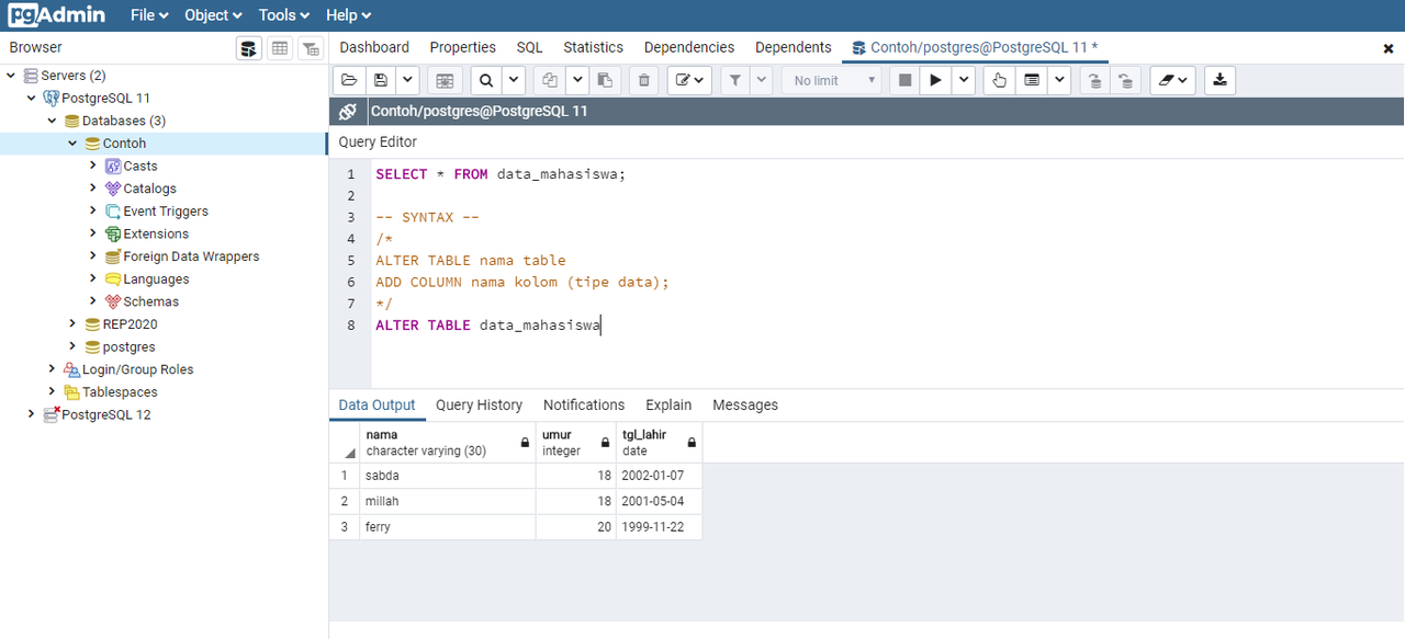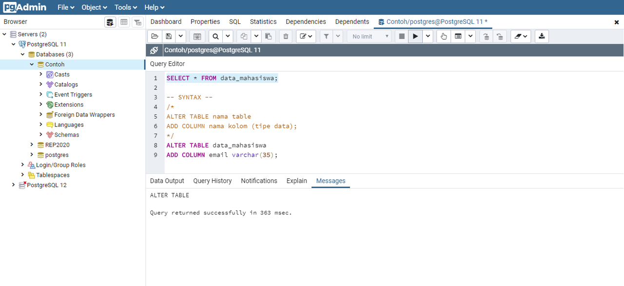 2. Disini Sabda akan menambahkan Kolom email jadi sabda tinggal mengetikan ADD COLUMN email (tipe datanya); Lalu kita block dan kita run (F5)