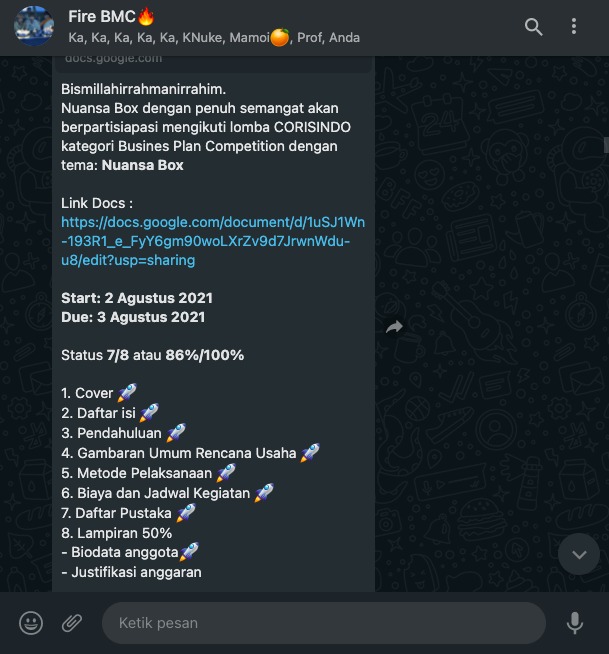 Dicermi kali ini Nan ingin sharing nih pengalaman mengikuti BPC CORISINDO dengan membawakan Nuansa Box. Pegalaman ini super seru banget hahah bisa team work dengan Ka Efa dan dari Alphabet Incubator sendiri berkontribusi sebanyak 3 BPC, yaitu Nuansa Box (Nanda&Kefa) , C🅰️🚀 (Nesti&Dwi) dan ABC (Muma&Sabda) yang didampingi oleh Kak Nuke. Nah alhamdulillah BPC ini diselesaikan dengan waktu yang fantastis yaitu selama 4 hari.