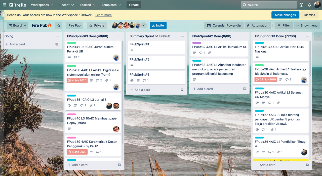 Berikut penggunaan trello saat di FirePub yang isinya jadwal kegiatan menggunakan latex🚀🚀