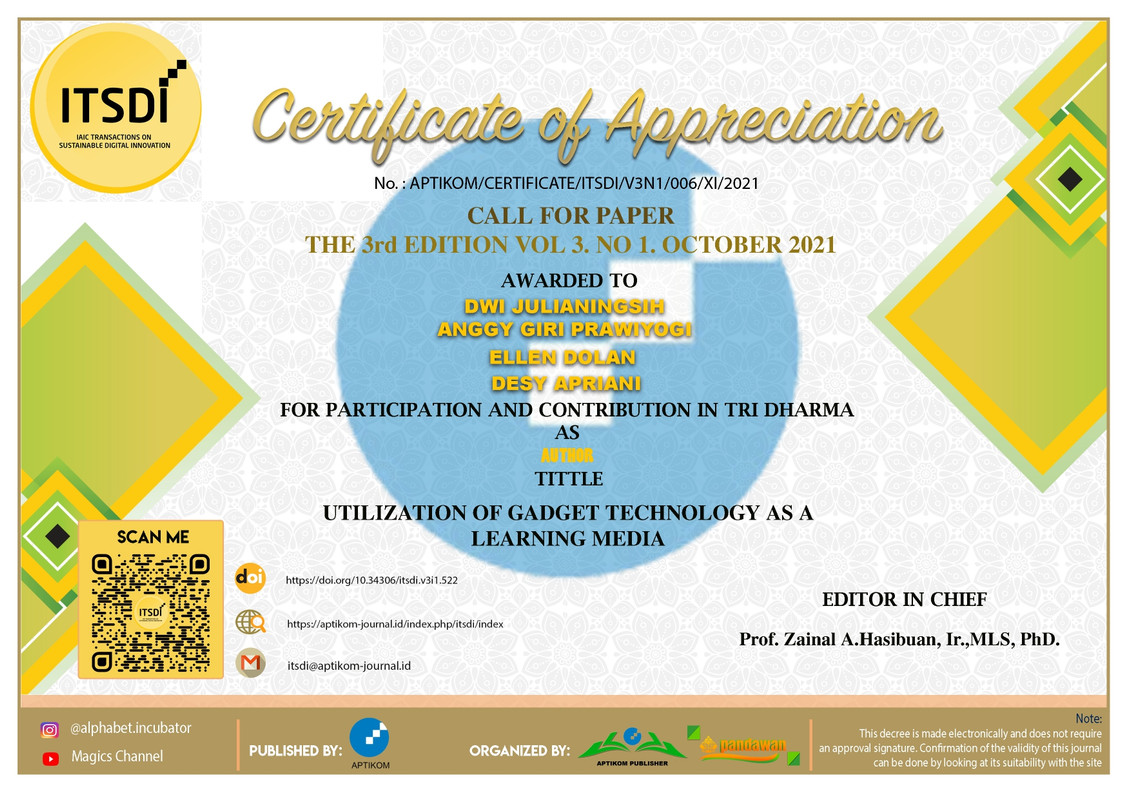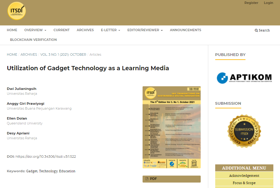 Alhamdulillah luaran wajib kali ini Dj menghasilkan sebuah paper inggris yang Dj submit ke dalam ITSDI^^ Paper Dj yang disubmit kedalam ITSDI dipublish pada tanggal 07 November 2021 yang berjudul Utilization of Gadget Technology as a Learning Media