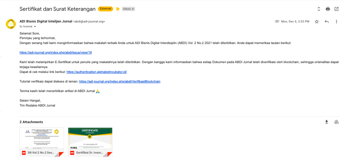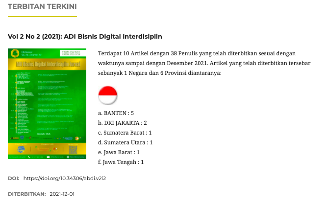 ABDI menyediakan media untuk menerbitkan artikel ilmiah dari para sarjana dan pakar di seluruh dunia terkait dengan topik Multidisiplin. Semua artikel yang dikirimkan akan menjalani proses Peer-Reviewing dengan Double-Blind yang ketat. Semua URL artikel yang diterbitkan akan memiliki Digital Object Indentifier (DOI) kemudian penulis akan mendapatkan e-LoA; e-Sertifikat; dan e-Journal yang dirancangan dalam Blockchain pada ADI Publisher.