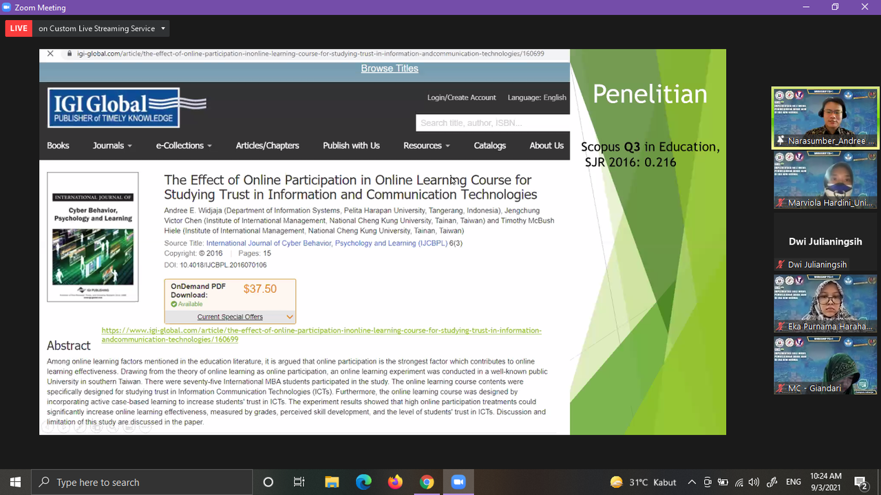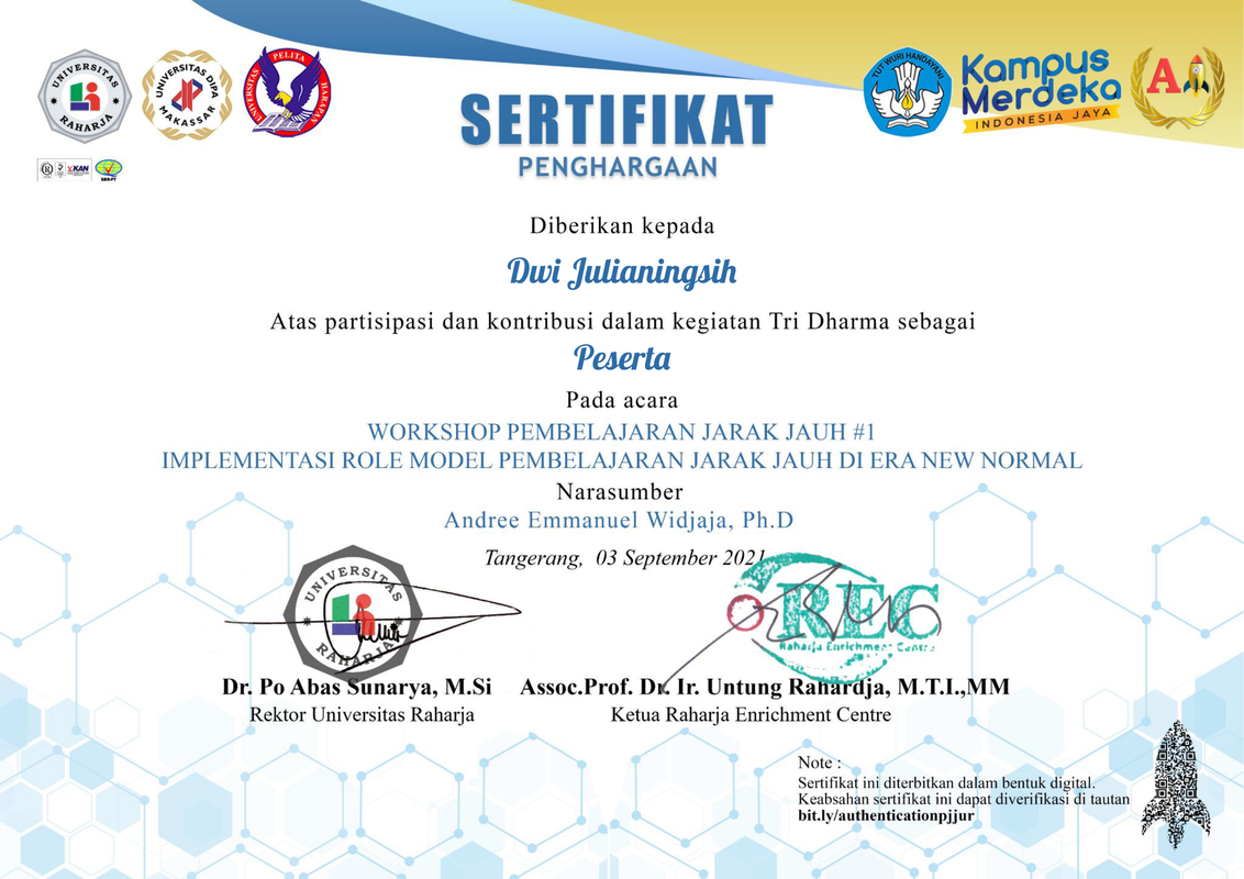 Pada tanggal 3 September 2021 Dj mengikuti Workshop PJJ(Pelajaran Jarak Jauh) #1 yang diadakan via zoom yang seruu lohh dengan nama ” IMPLEMENTASI ROLE MODEL PEMBELAJARAN JARAK JAUH DI ERA NEW NORMAL 🎓 ”
